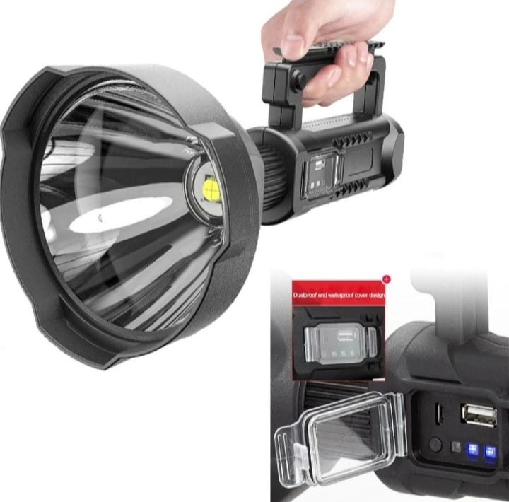 A powerful, pistol-style rechargeable torch designed for bright, focused lighting. Ideal for outdoor activities, emergencies, and general use. Includes a tripod for hands-free lighting when needed.